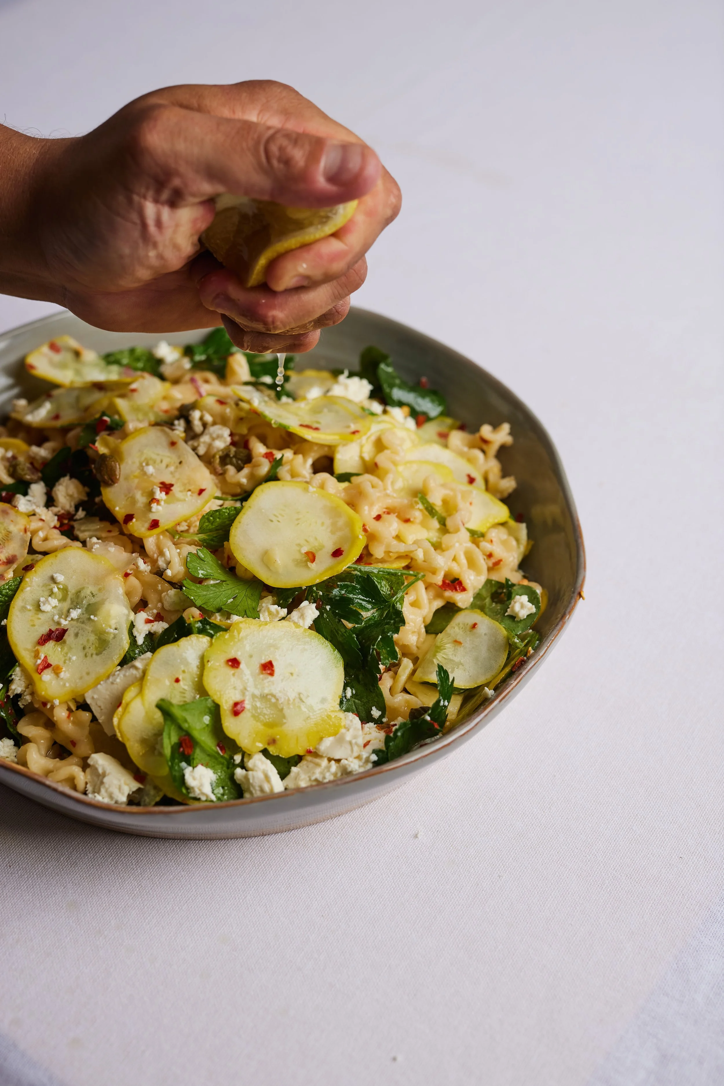Add the cooked pasta, reserved pasta water, lemon juice, feta, and capers. Stir to combine and season with salt, pepper, and red pepper flakes.